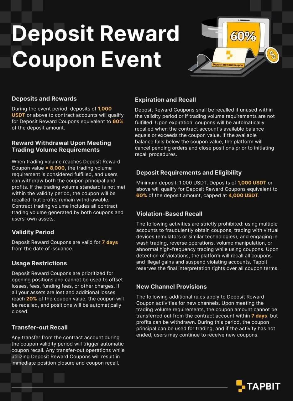 🔥 [TAPBIT] 60% Deposit Bonus Event 🔥⭐️ Get up to 4,000 USDT Bonus ⭐️🟢 60% Deposit Promotion LIVE 🟢📎 Tapbit Event + Auto 40% Self-Referral Signup Link‼️ UID Required ‼️👉 https://www.tapbit.com/auth/SLM_HJKPHSK🗓 Event Period🕒 Apr 26, 2026 (01:00) – May 6, 2026 (19:00)📌 Event Details✅ Rewards• Deposit 1,000 USDT or more into your Futures account➡️ Receive a 60% bonus coupon based on your d..